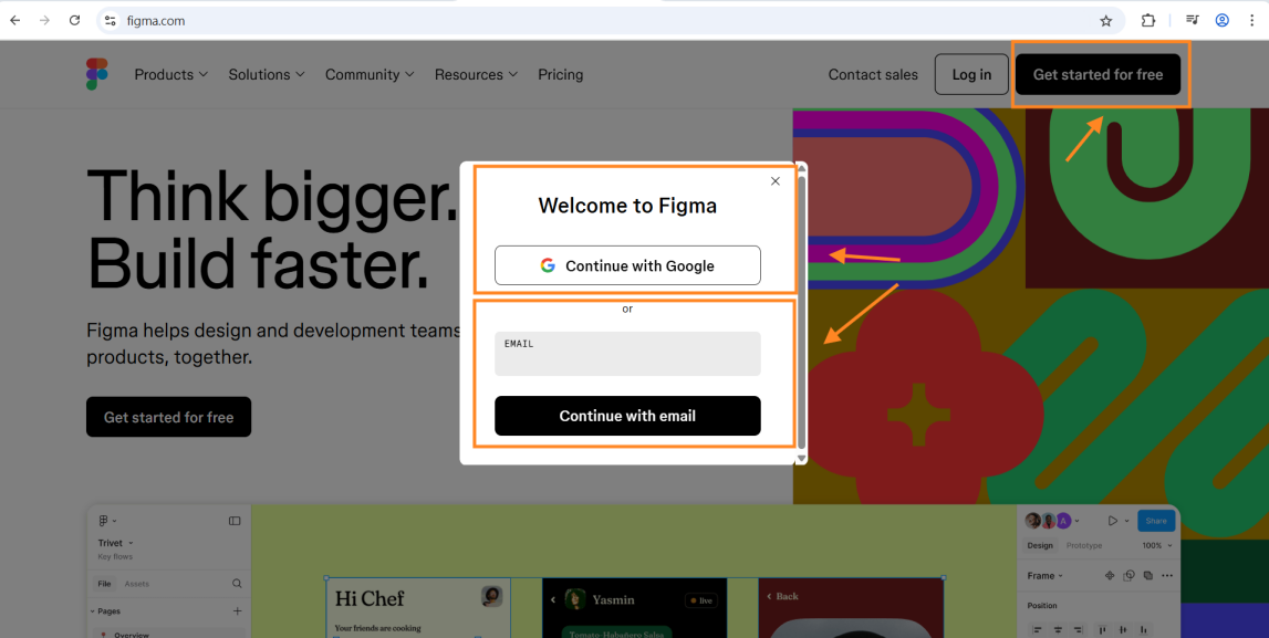 Go to figma.com and click “Get Started” . You can sign up with Google, or email.